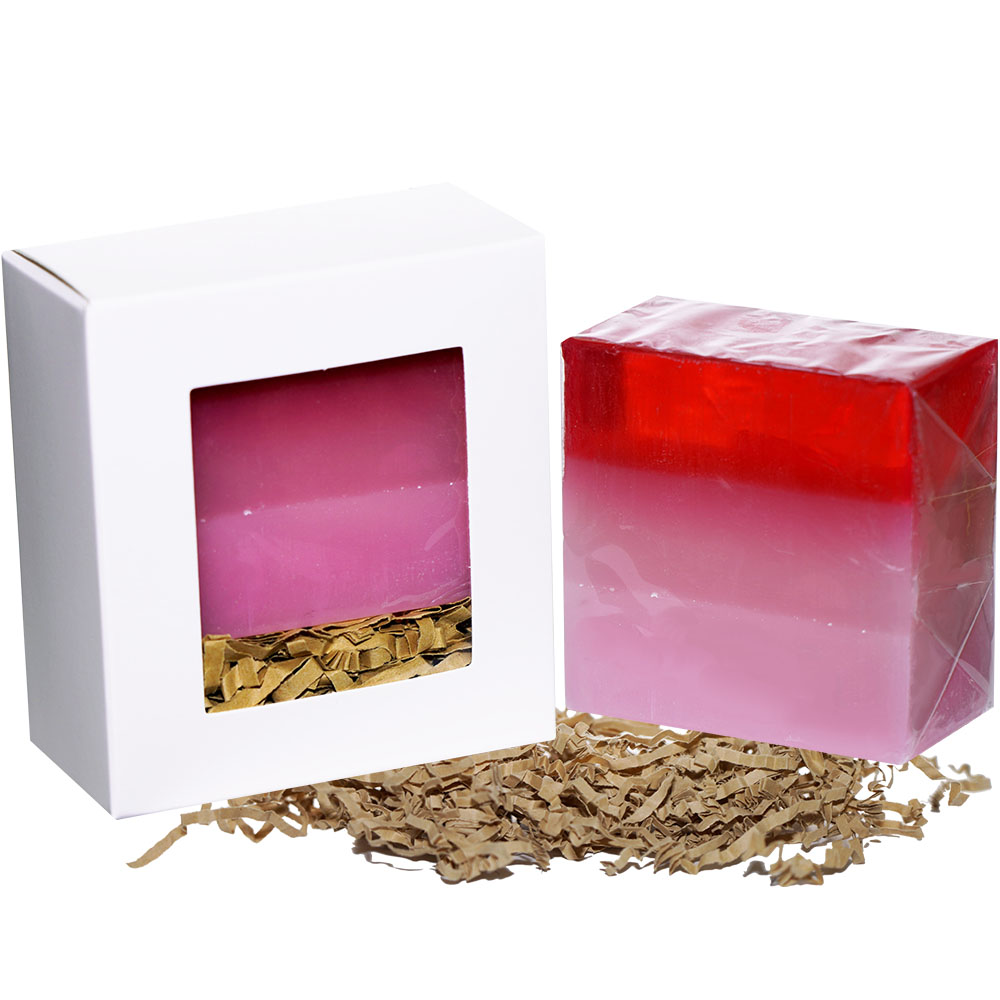 This skin soothing soap is scented and coloured strawberry with premium oils and essential oils, which are all knows for their natural benefits to the skin. The two tone soap design with a fine line of  pink and red clay is a nice statement piece in every bath room or a gift pack.