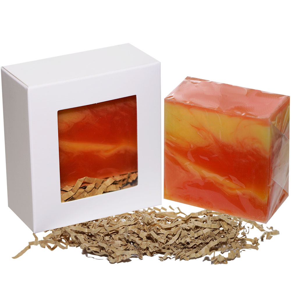 This skin soothing soap is scented with premium oils and essential oils, which are all knows for their natural benefits to the skin. The three tone soap design with a fine line of yellow, orange, and red clay is a nice statement piece in every bath room or a gift pack.