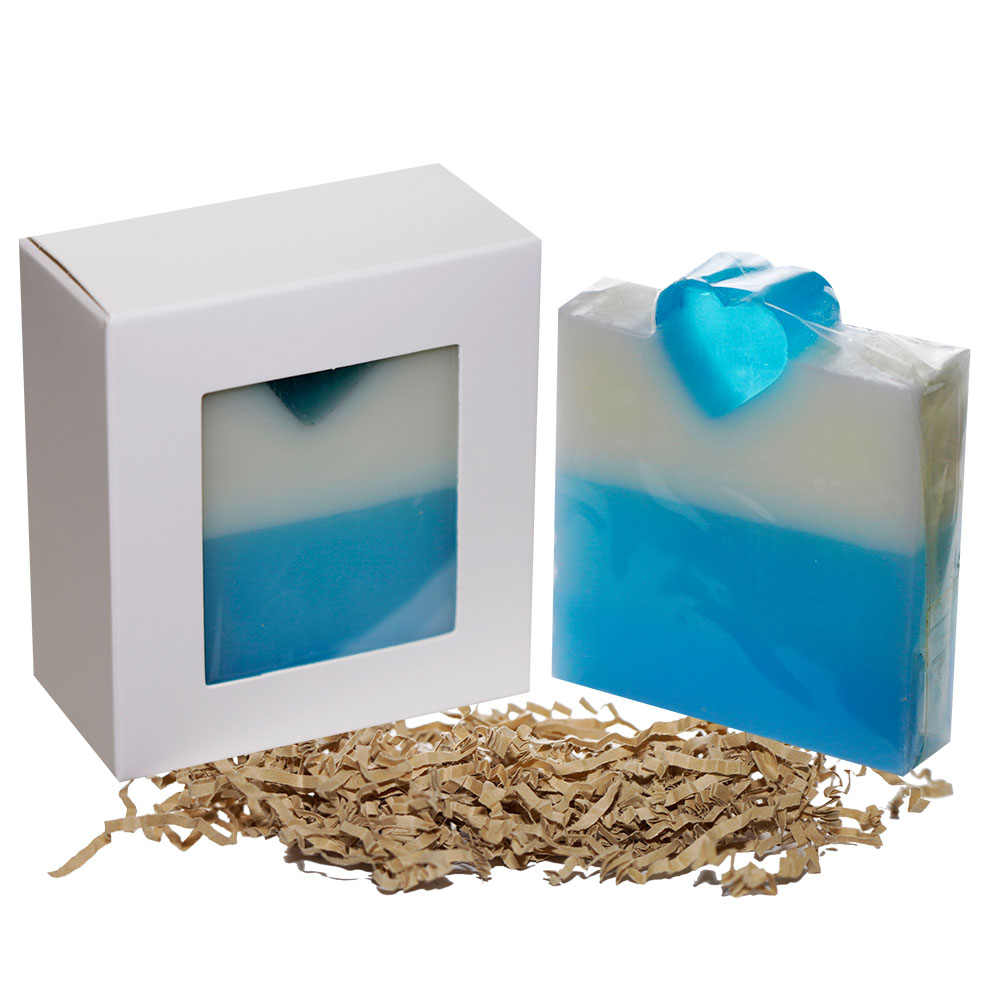 This skin soothing soap is scented with premium oils and essential oils, which are all knows for their natural benefits to the skin. The two tone soap design with a fine line of white and ocean blue clay is a nice statement piece in every bath room or a gift pack.